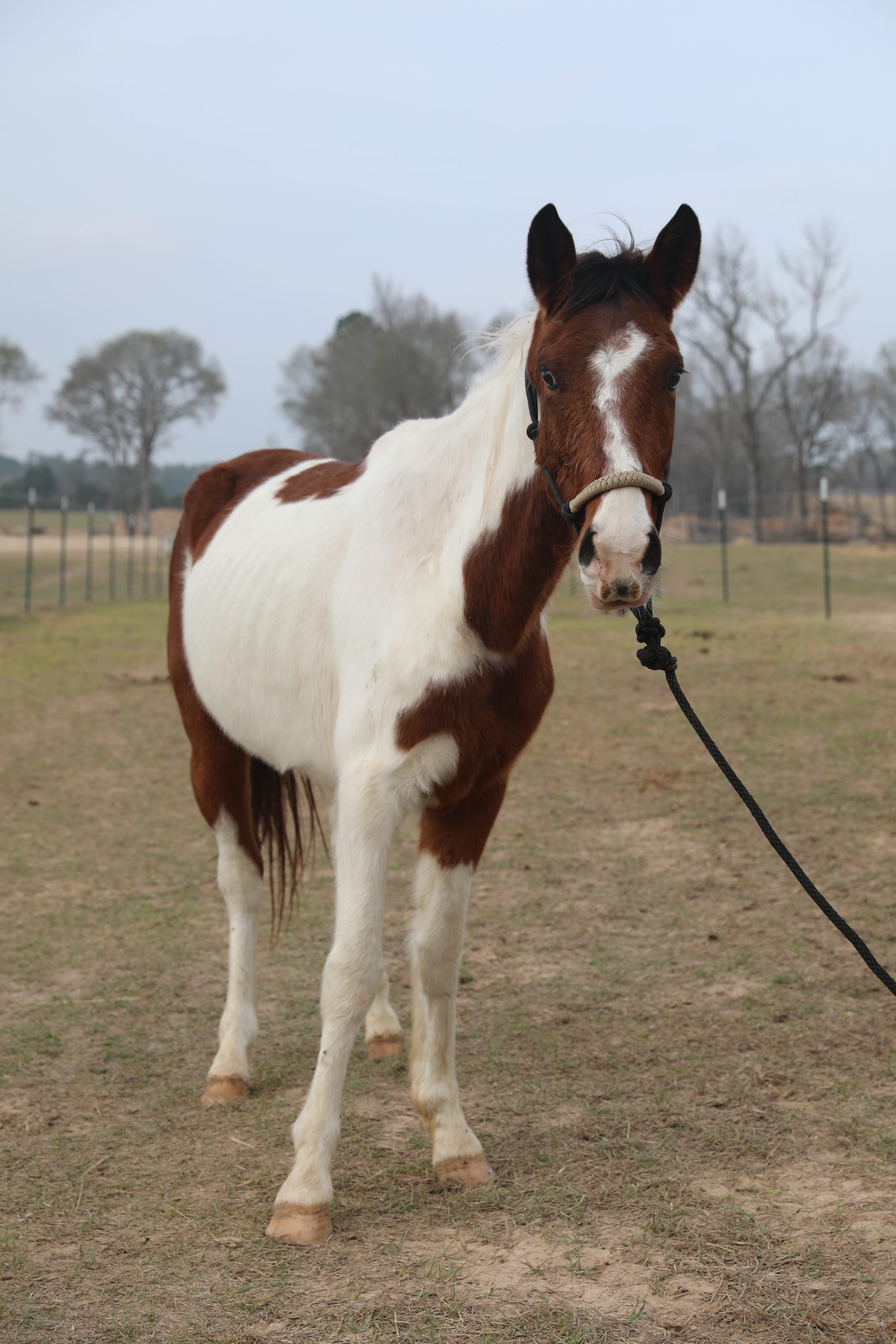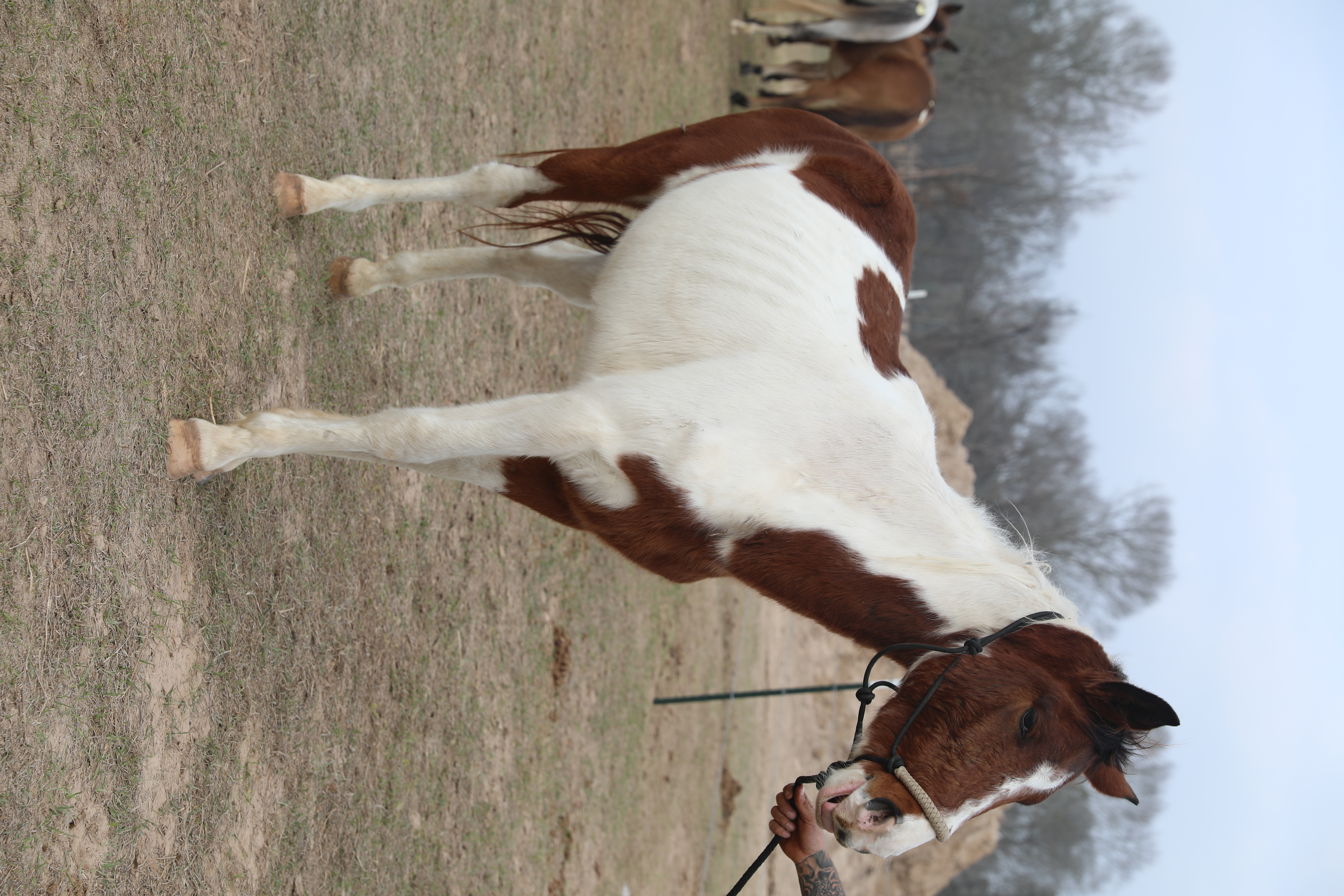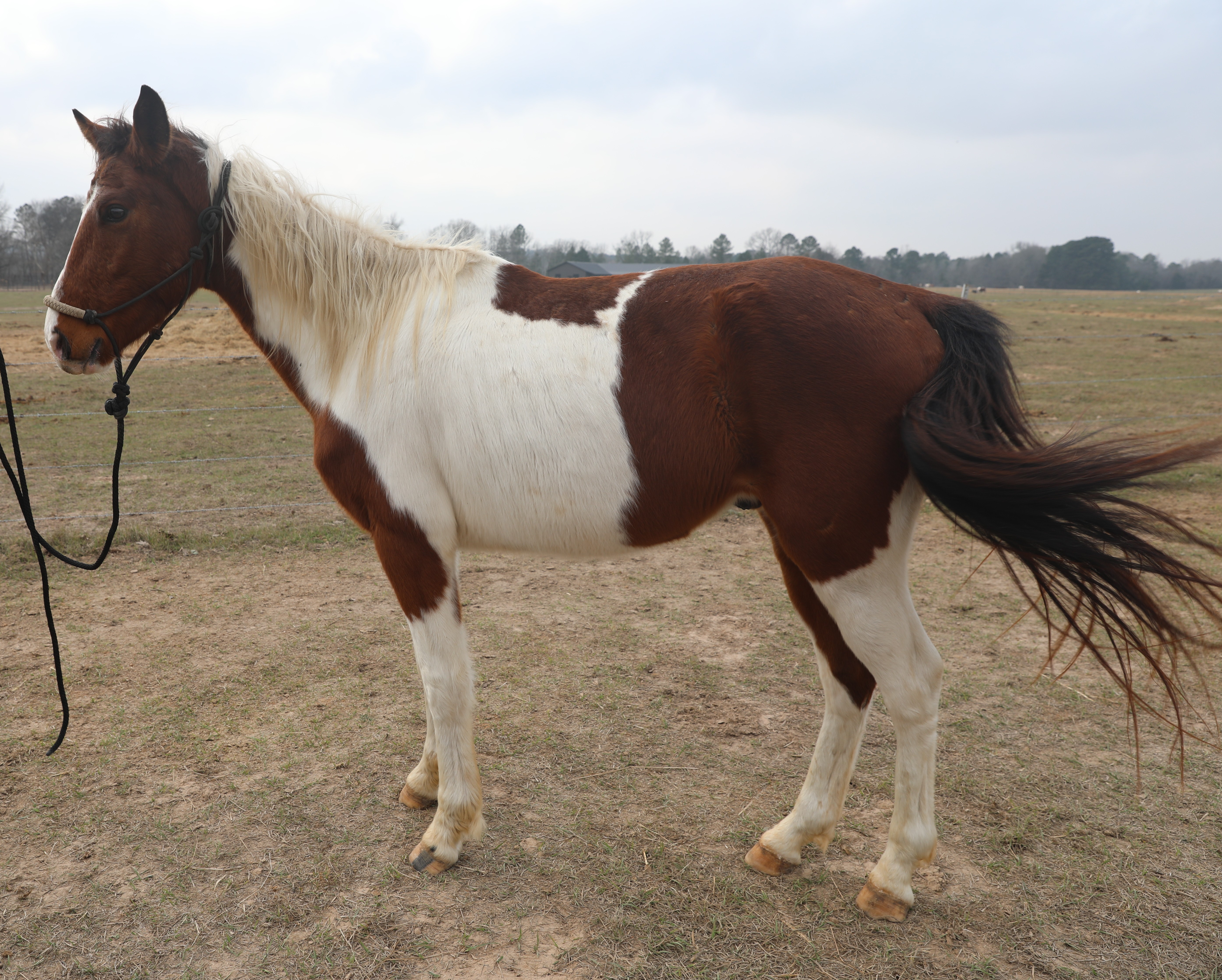 Cain is a striking sorrel and white paint gelding with beautifully unique markings that make him a true standout. Beyond his eye-catching appearance, he has a gentle, kind spirit and a calm presence that’s easy to appreciate.