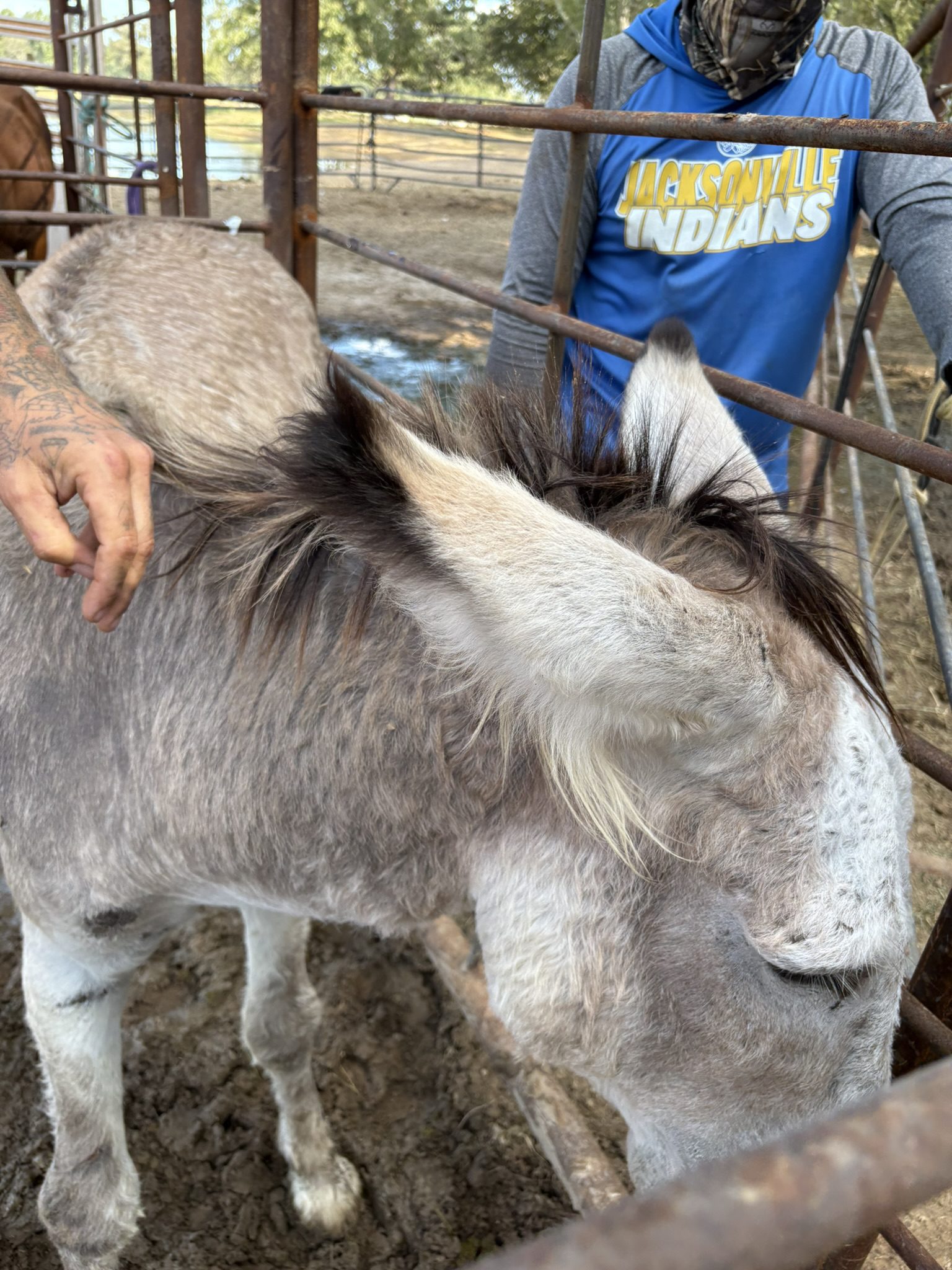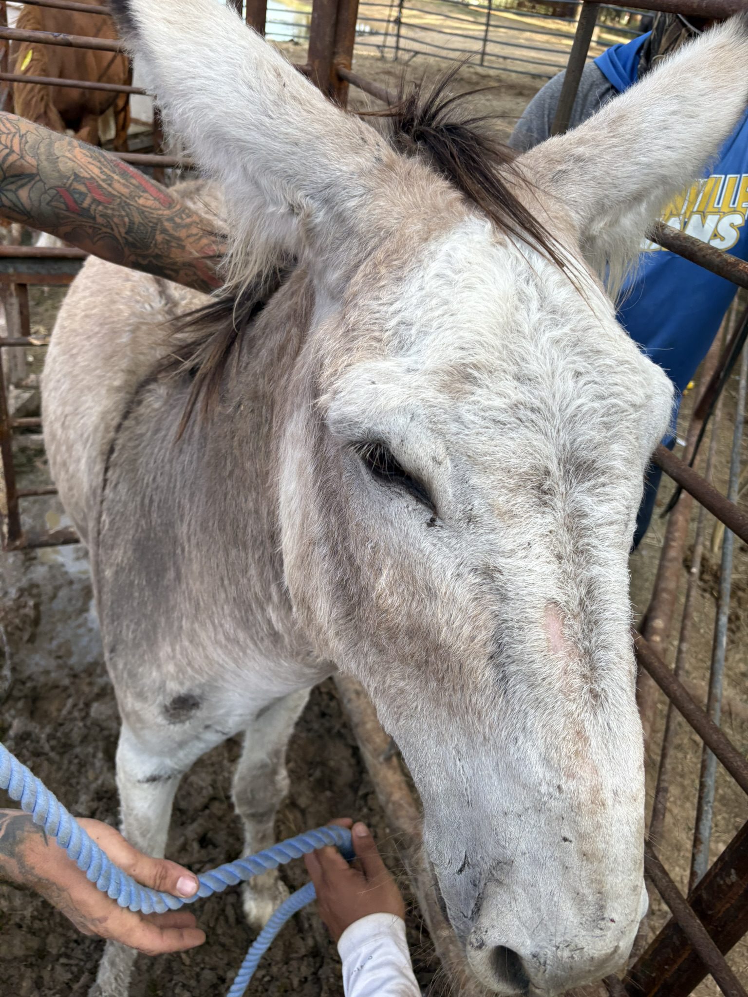 Marley is a pretty gray red roan donkey with a soft, eye-catching coat that blends gentle shades of gray and warm red throughout. He has a kind expression, long ears that add to his charm, and a calm, steady presence. Marley’s unique coloring makes him stand out, and his sweet, approachable nature makes him a joy to be around. He would be a wonderful addition for anyone looking for a handsome donkey with both personality and appeal.