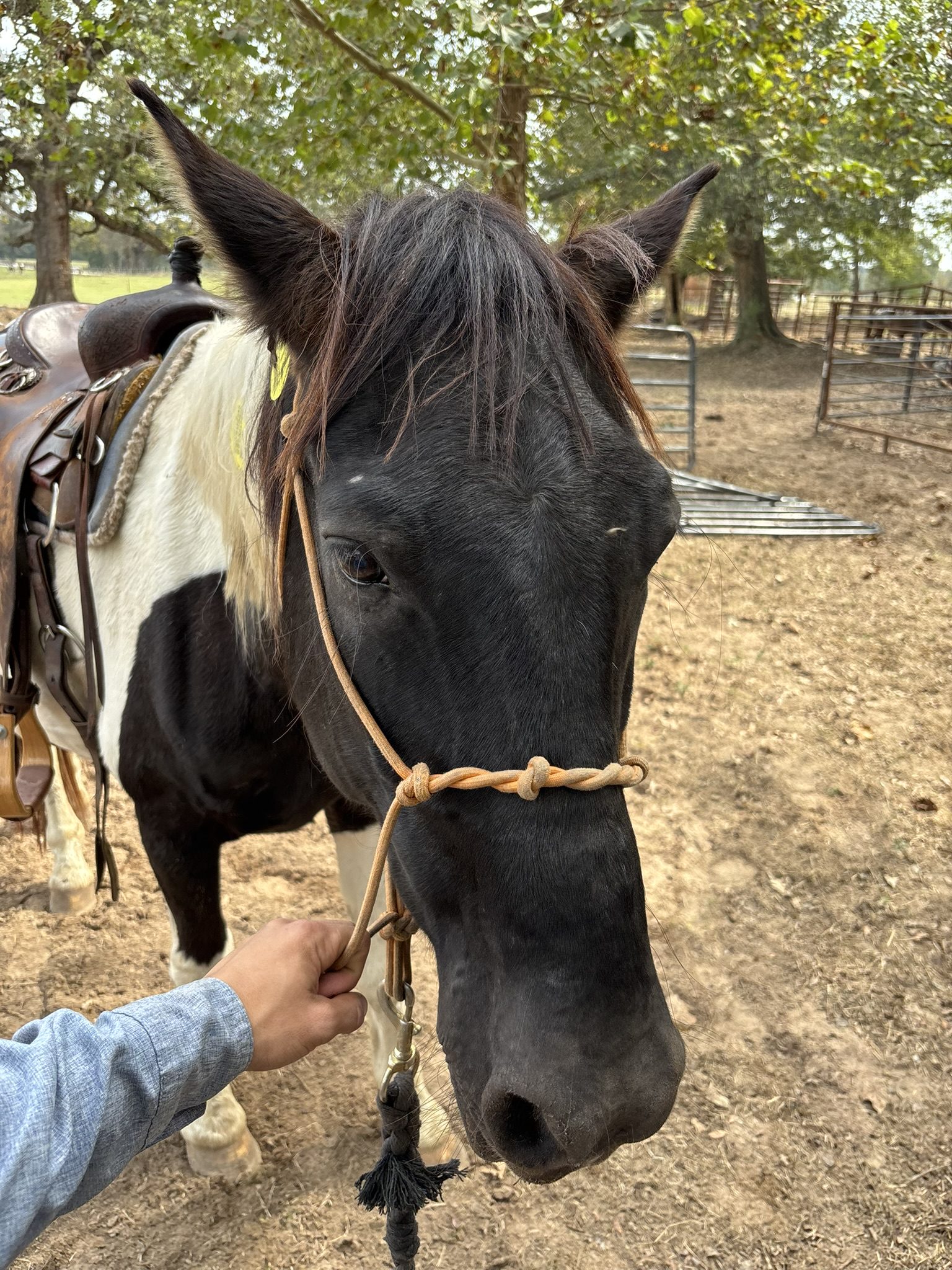 Meet Pebbles, a striking black Paint horse with a shiny coat and a gentle, friendly personality. His bold coloring and kind expression make him stand out, but it’s his sweet temperament that truly makes him special.
