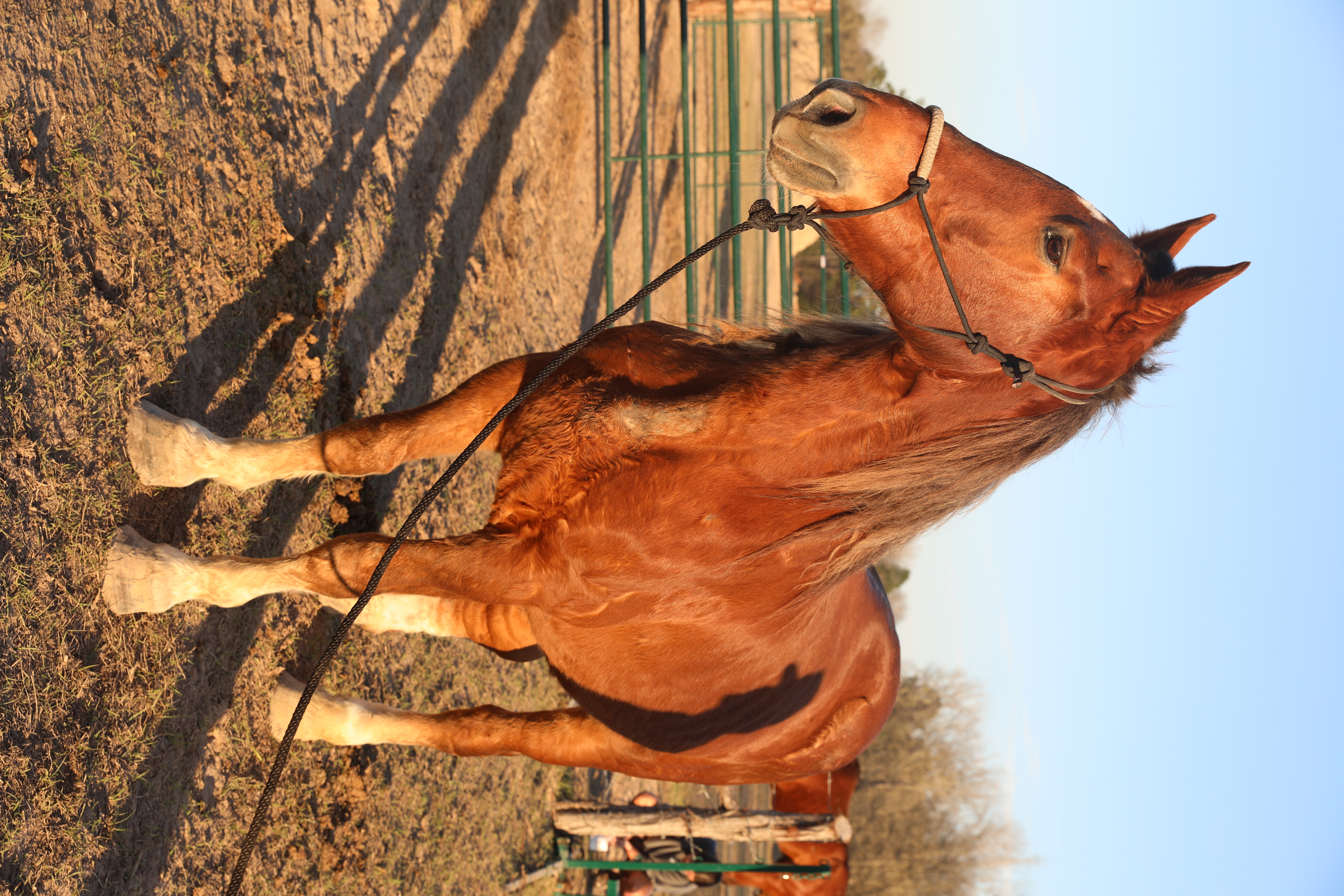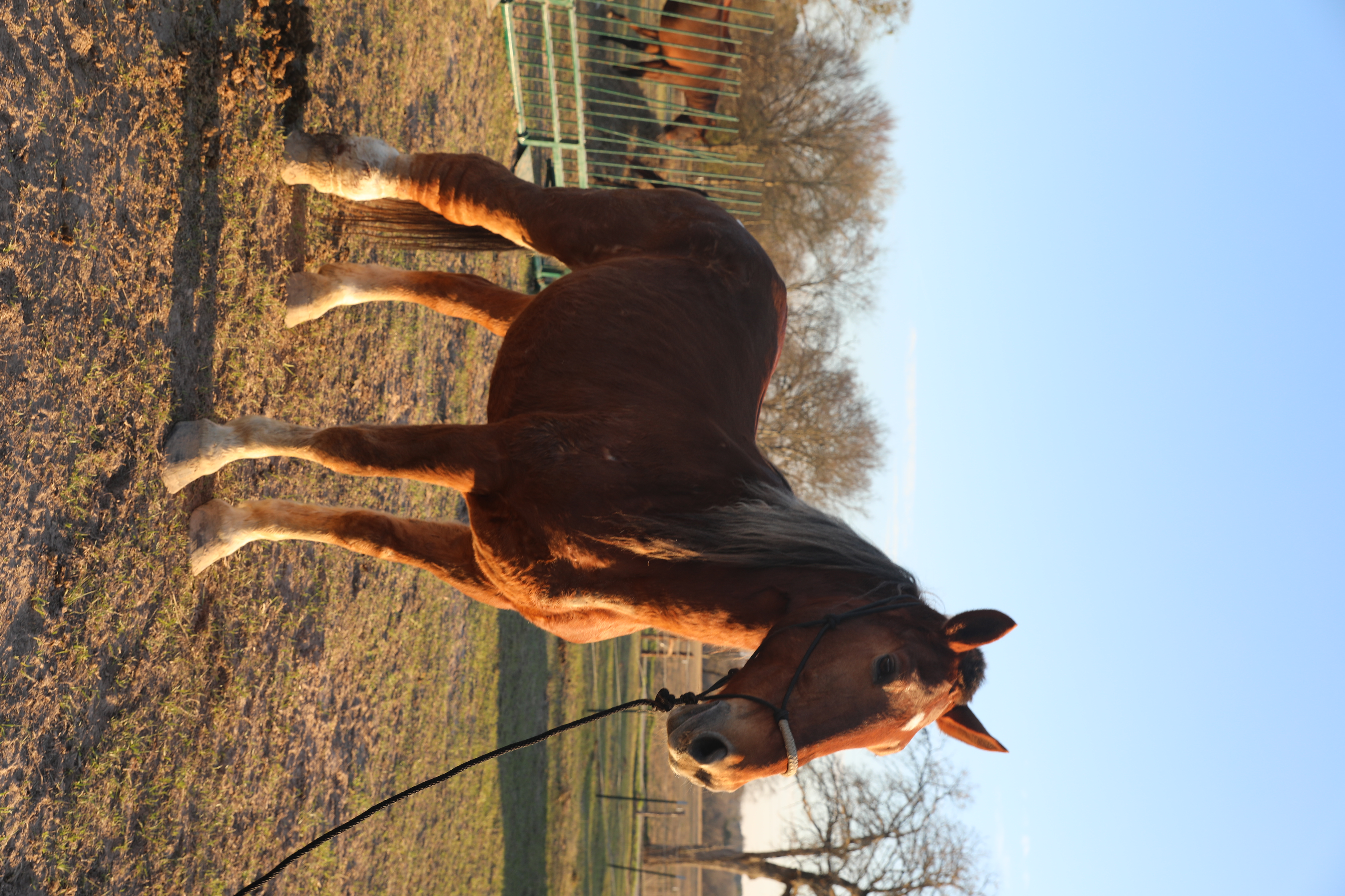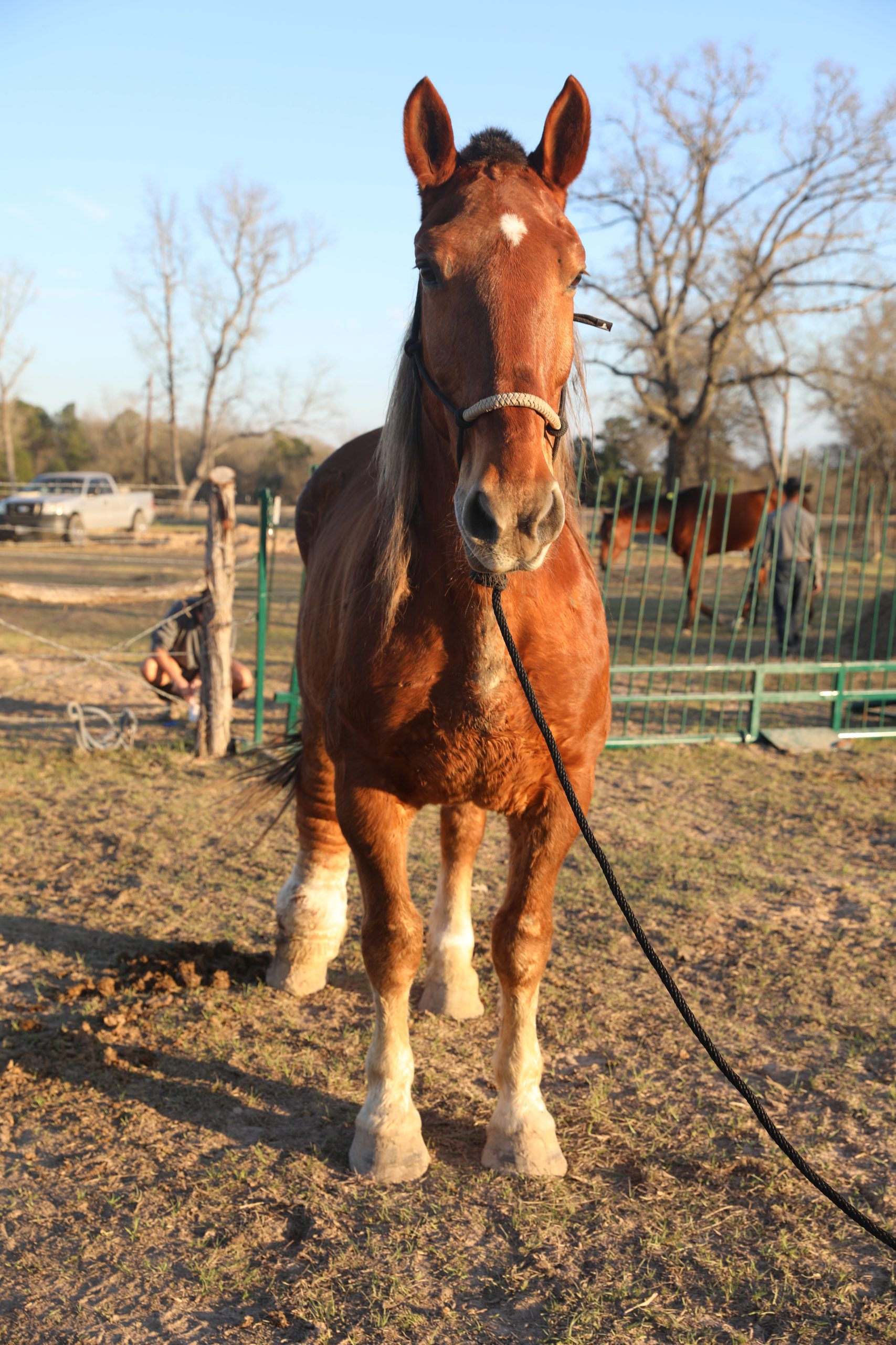 Socks is a sorrel draft gelding who gets his name from the white markings on his lower legs that resemble high-top socks. Like all the drafts out here, he is big and beautiful, with a solid, impressive build. What truly sets Socks apart is his loving, easygoing personality—he gets along wonderfully with anything and anyone, making him a joy to have around.