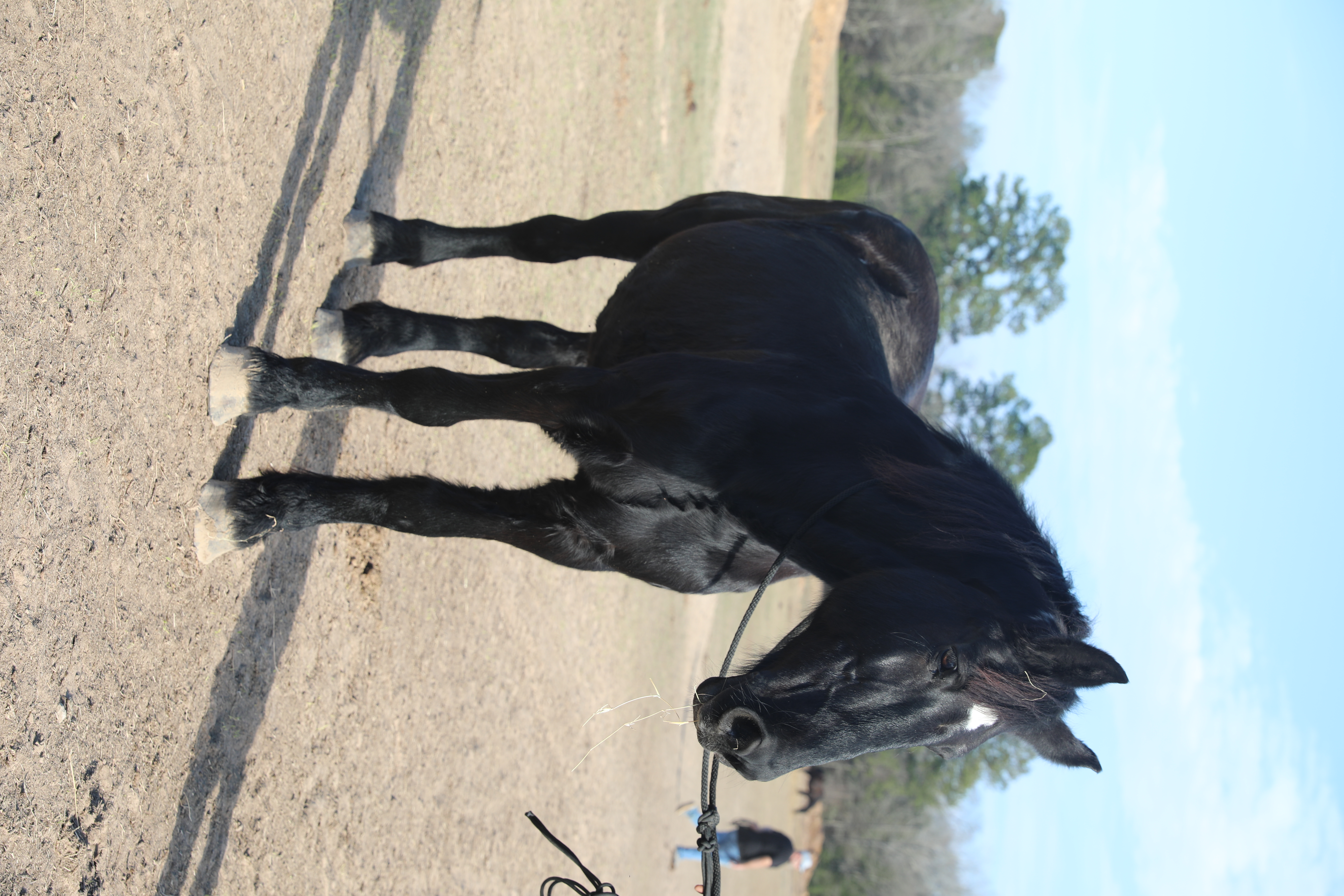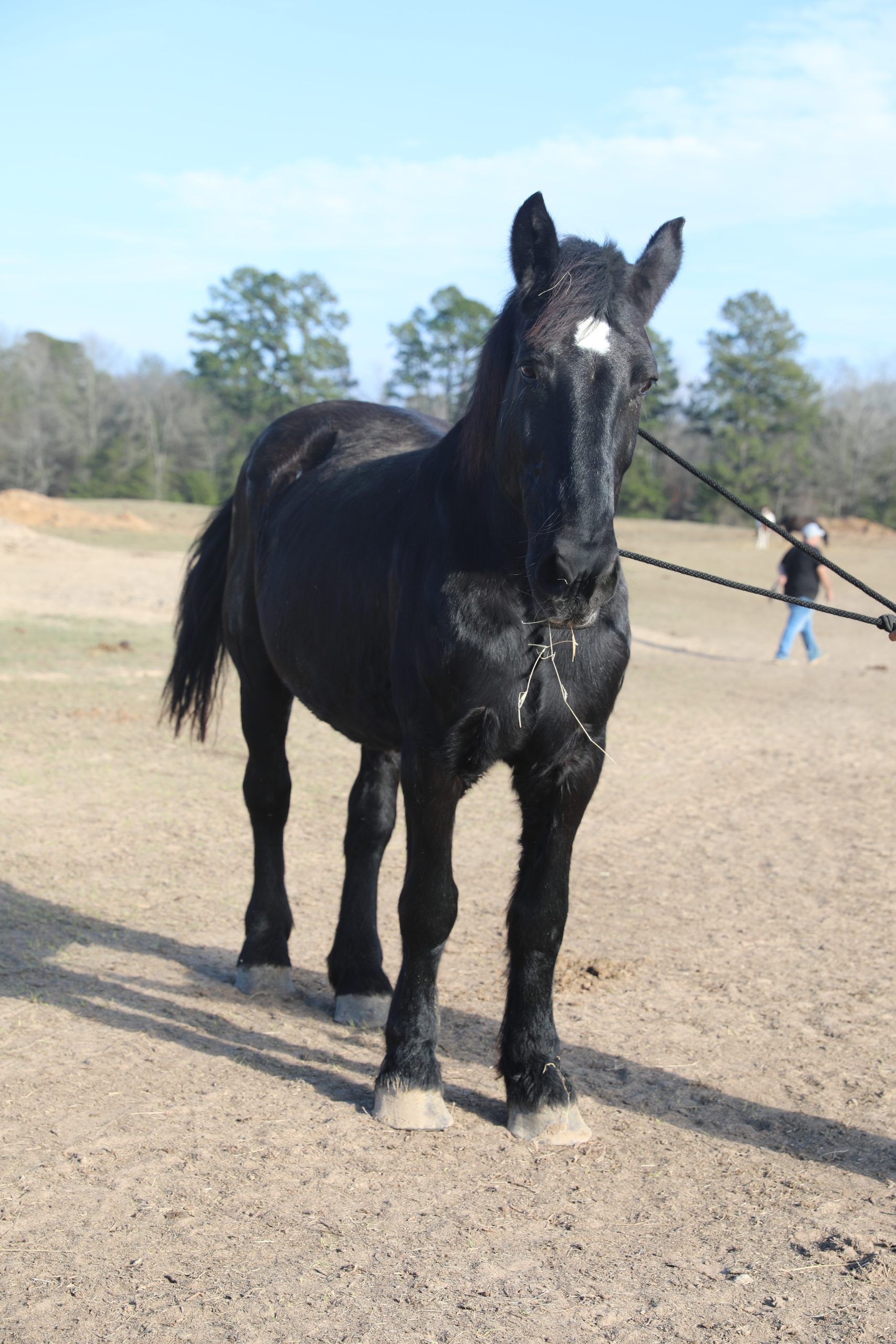Stacy is very much like Shadow in both size and temperament, a beautiful black Percheron mare with the same gentle, kind nature. Her white face marking is a little less prominent, giving her a bold and eye-catching appearance that sets her apart. Despite her impressive stature, Stacy is calm, affectionate, and loves attention, soaking up every moment spent with her. She combines striking looks with a soft, loving personality that makes her a joy to be around.