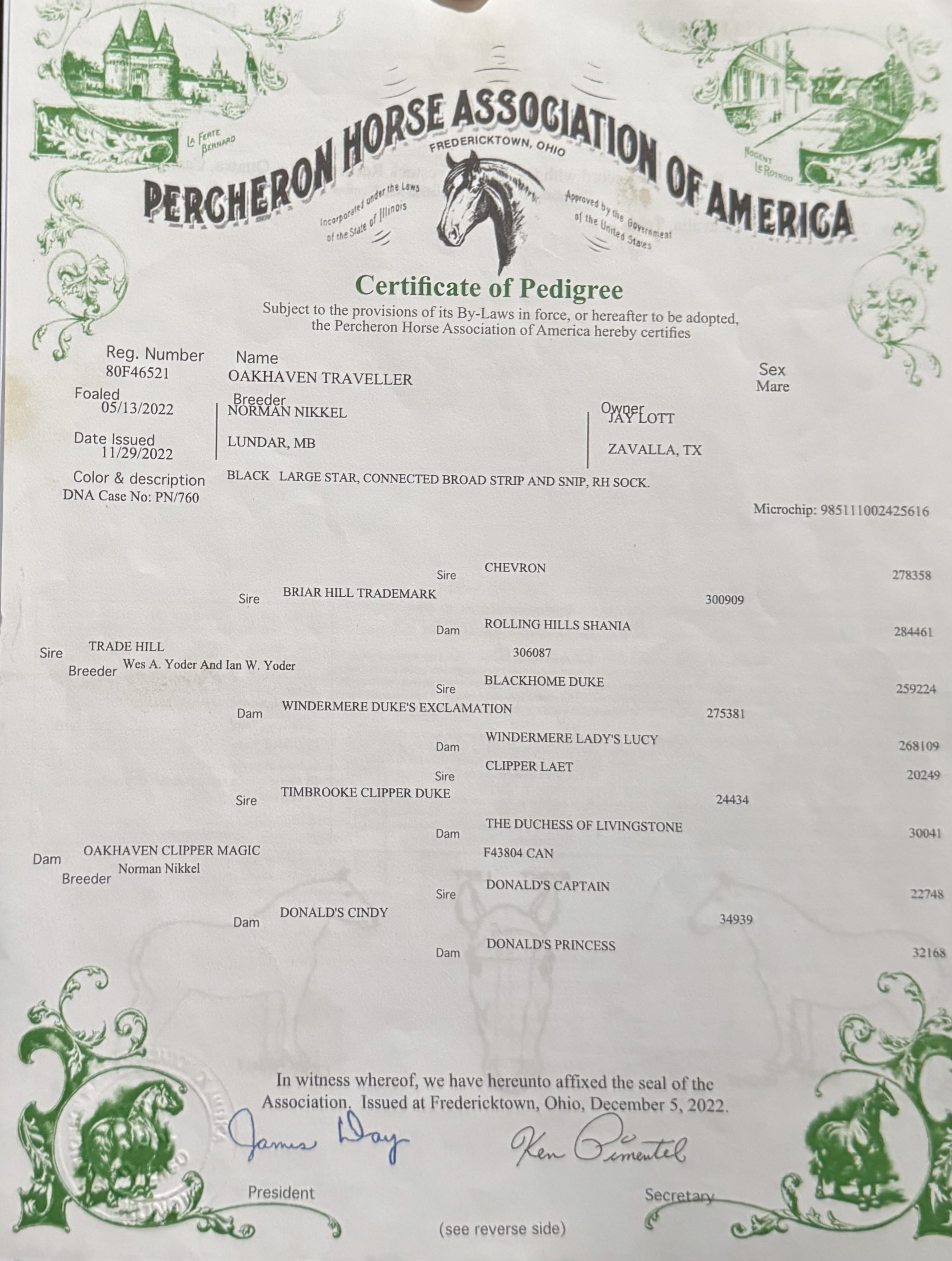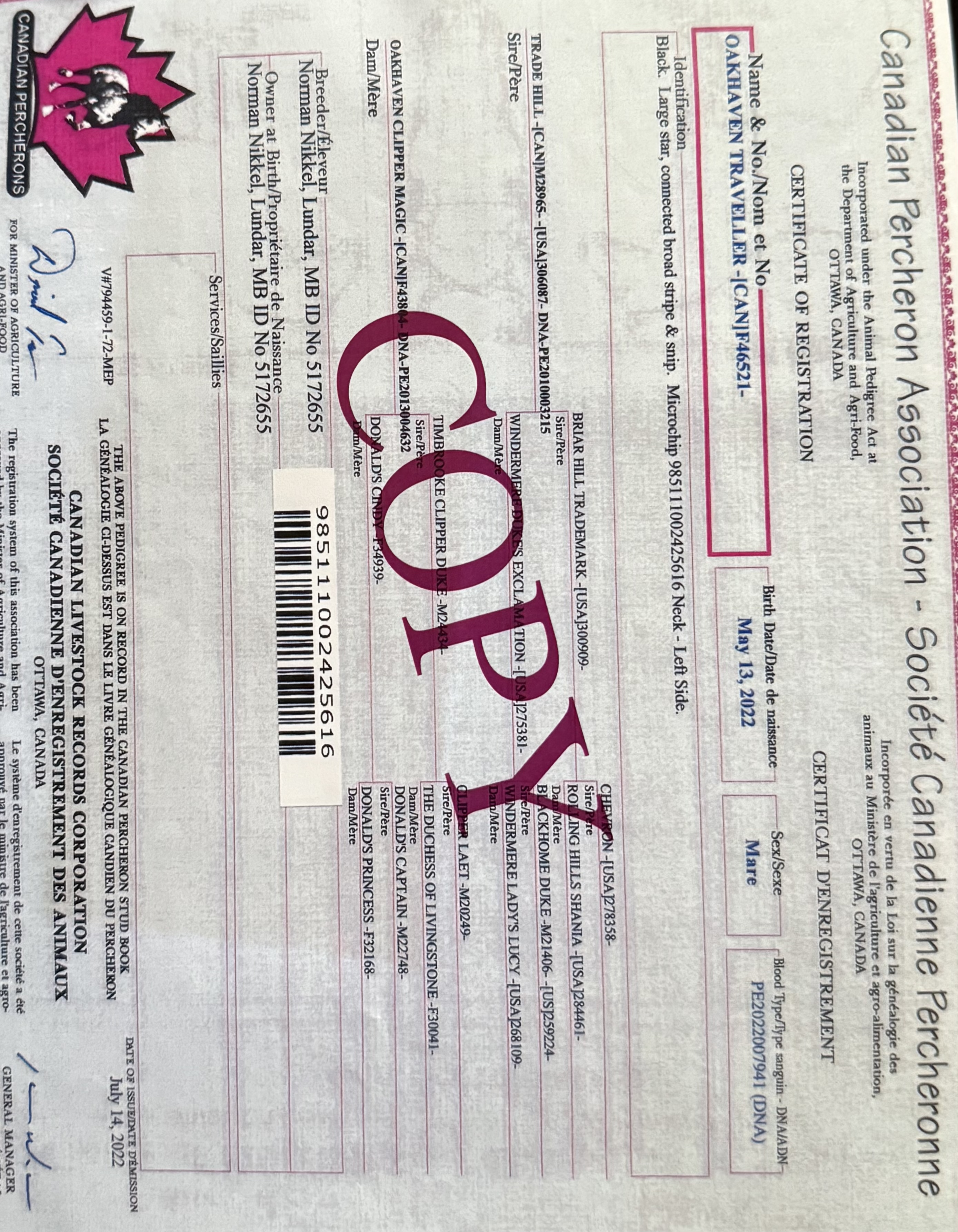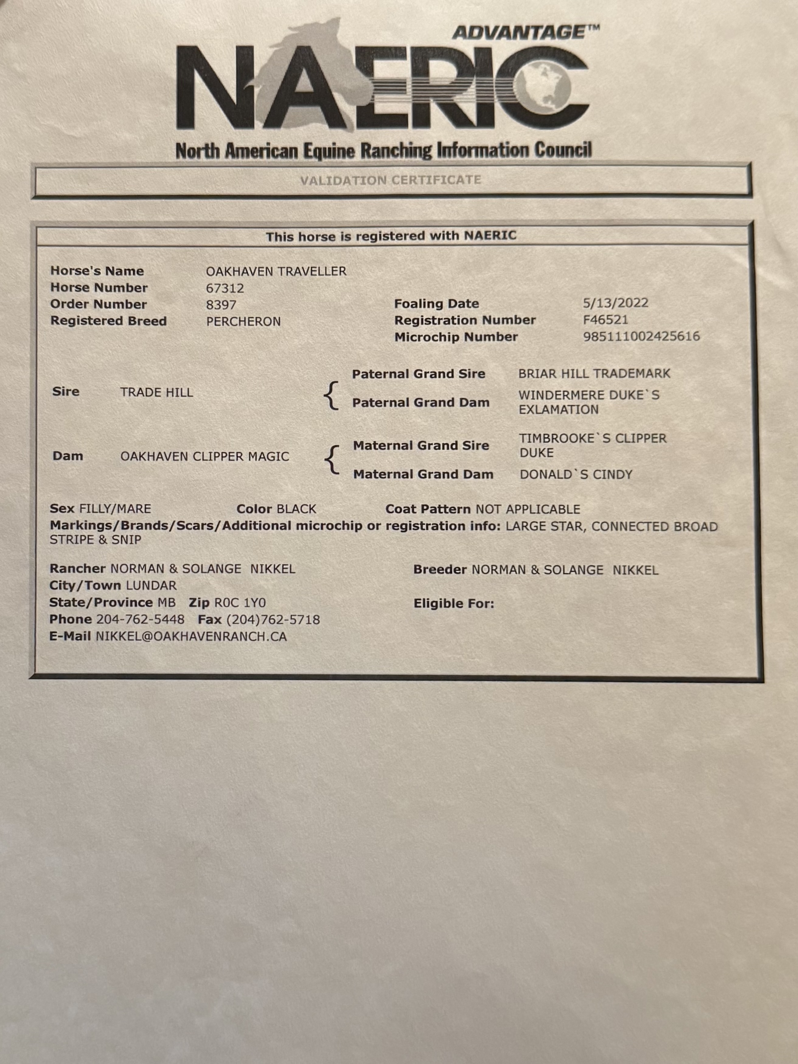 This beautiful black Percheron mare is registered with the Percheron Horse Association, the Canadian Percheron Association, and NAERIC, and she is also microchipped. At just three years old, she already has a strong foundation under saddle.
