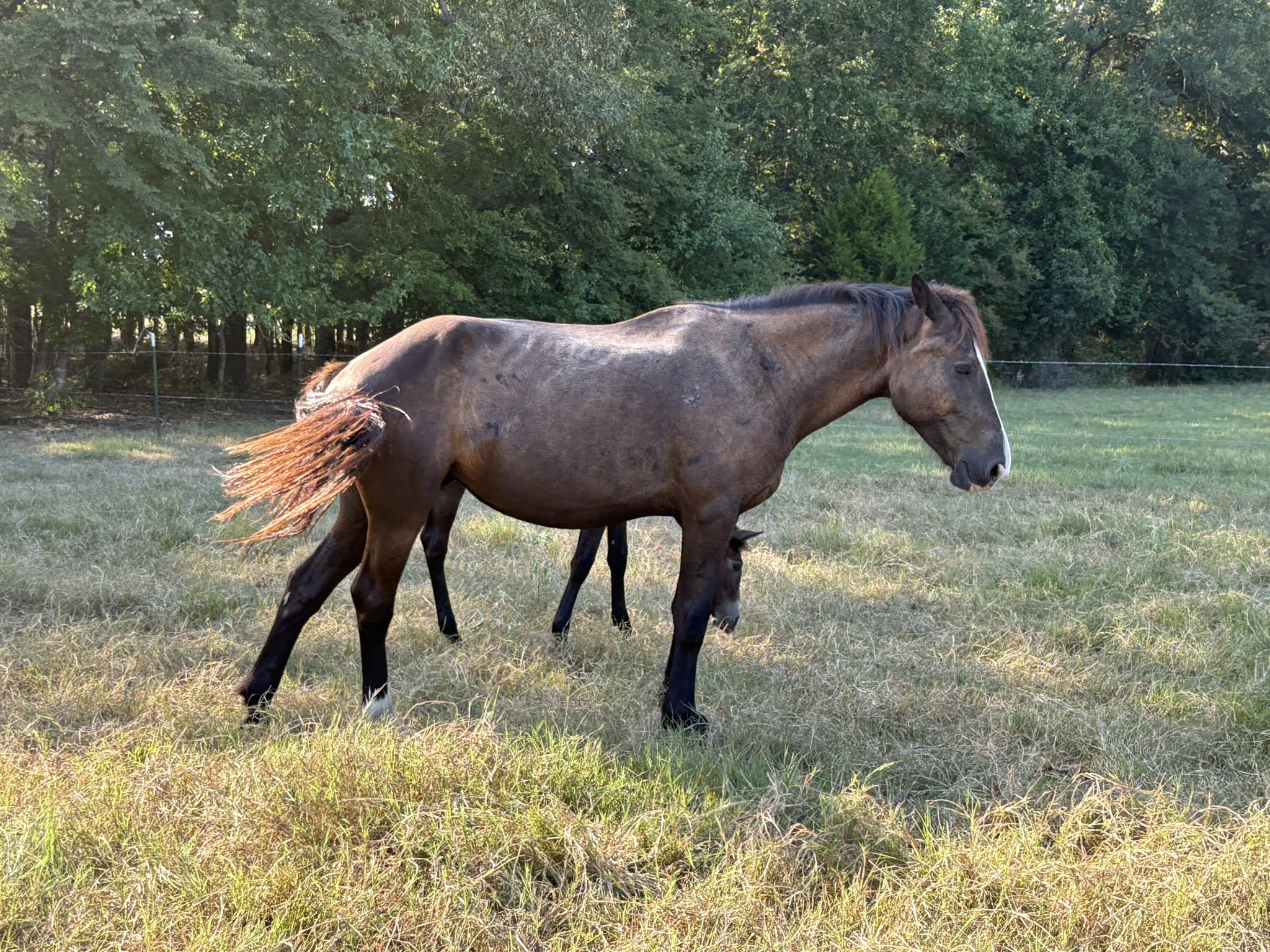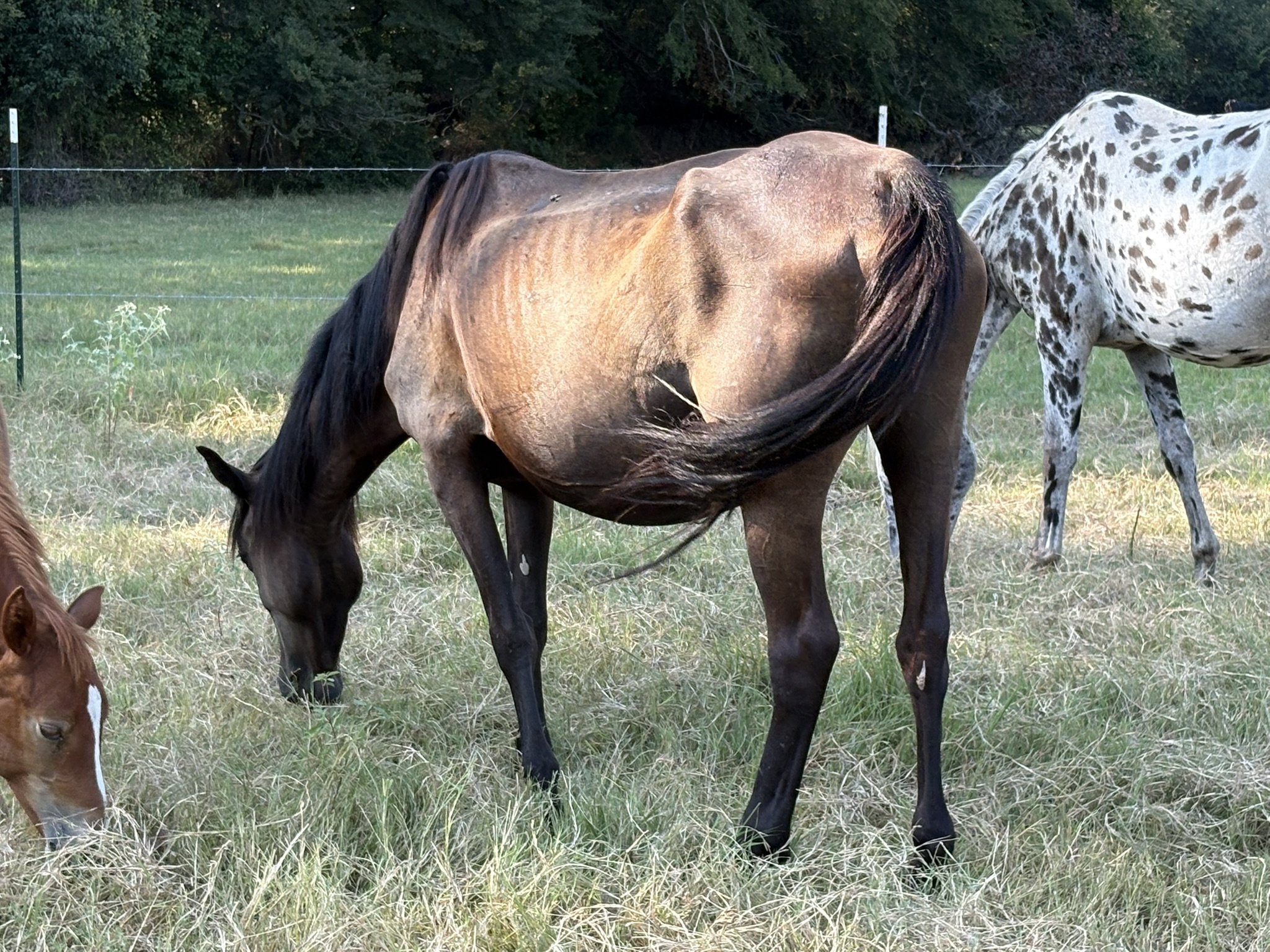 She has been saddle-started, with the hard work already done, and is coming along well under training. Gentle and well-mannered, she is also halter-broke and rides willingly. With her steady temperament and solid start, she has the potential to become a dependable partner as her training continues.